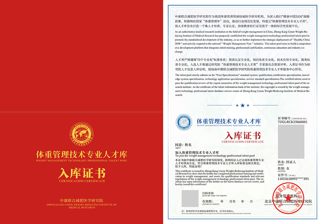 人才入庫證書是對個人在體重管理技術(shù)領(lǐng)域教育、培訓(xùn)、認證及工作履歷等方面的專業(yè)認可。獲得入庫證書,意味著持證人在體重管理技術(shù)方面具備一定的專業(yè)技能和知識水平,可作為其職業(yè)發(fā)展及用人單位人才選拔、培養(yǎng)、聘用、晉升的重要依據(jù)。